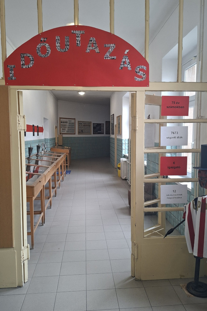 A kiállítás vitrines részében megtekinthetjük, hogy az iskola épülete, hogyan és mikor épült, bővült. Milyen szakokkal indult és változott később a profilja, fűszerezve a legelső osztálynaplókkal, technikusi oklevéllel, ellenőrzővel, bélyegzőkkel.